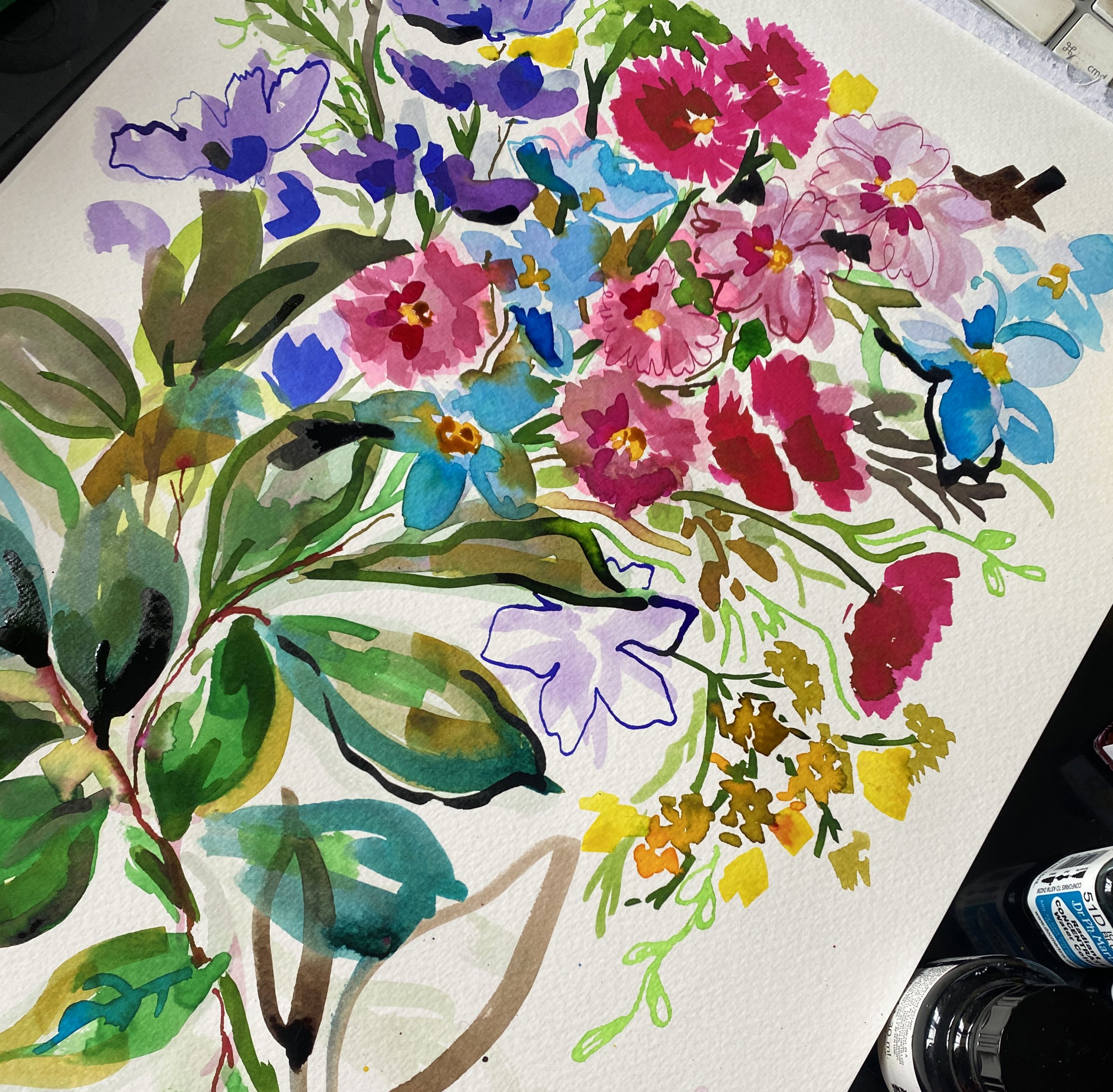 Using washes of watercolour, black fine liners and dip pens to create colourful, illustrative floral forms. Focusing on linear details of ornate flower shapes like Irises and daffodils.