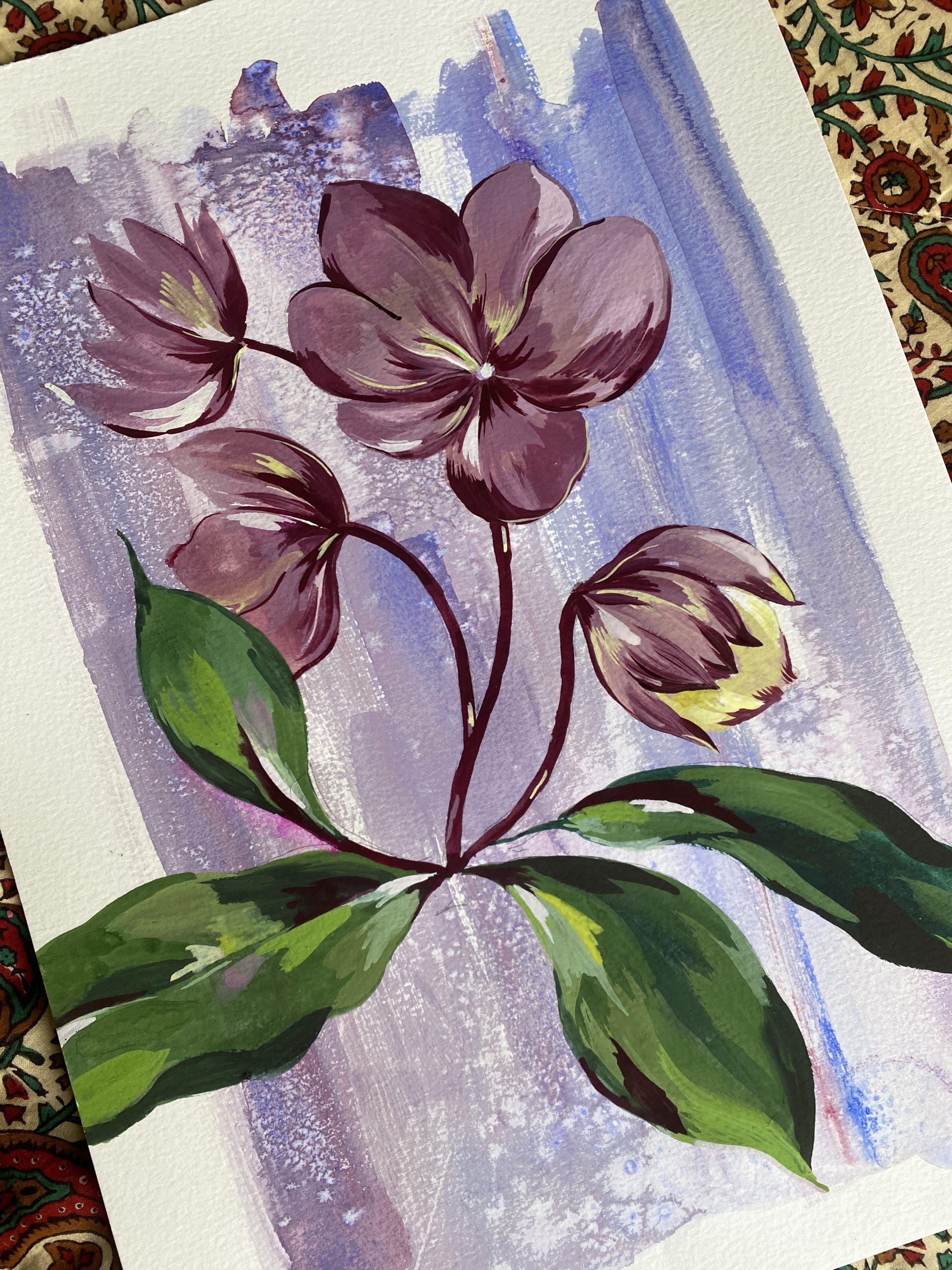 Winter Florals on dark moody grounds. Working with gouache snd watercolour..