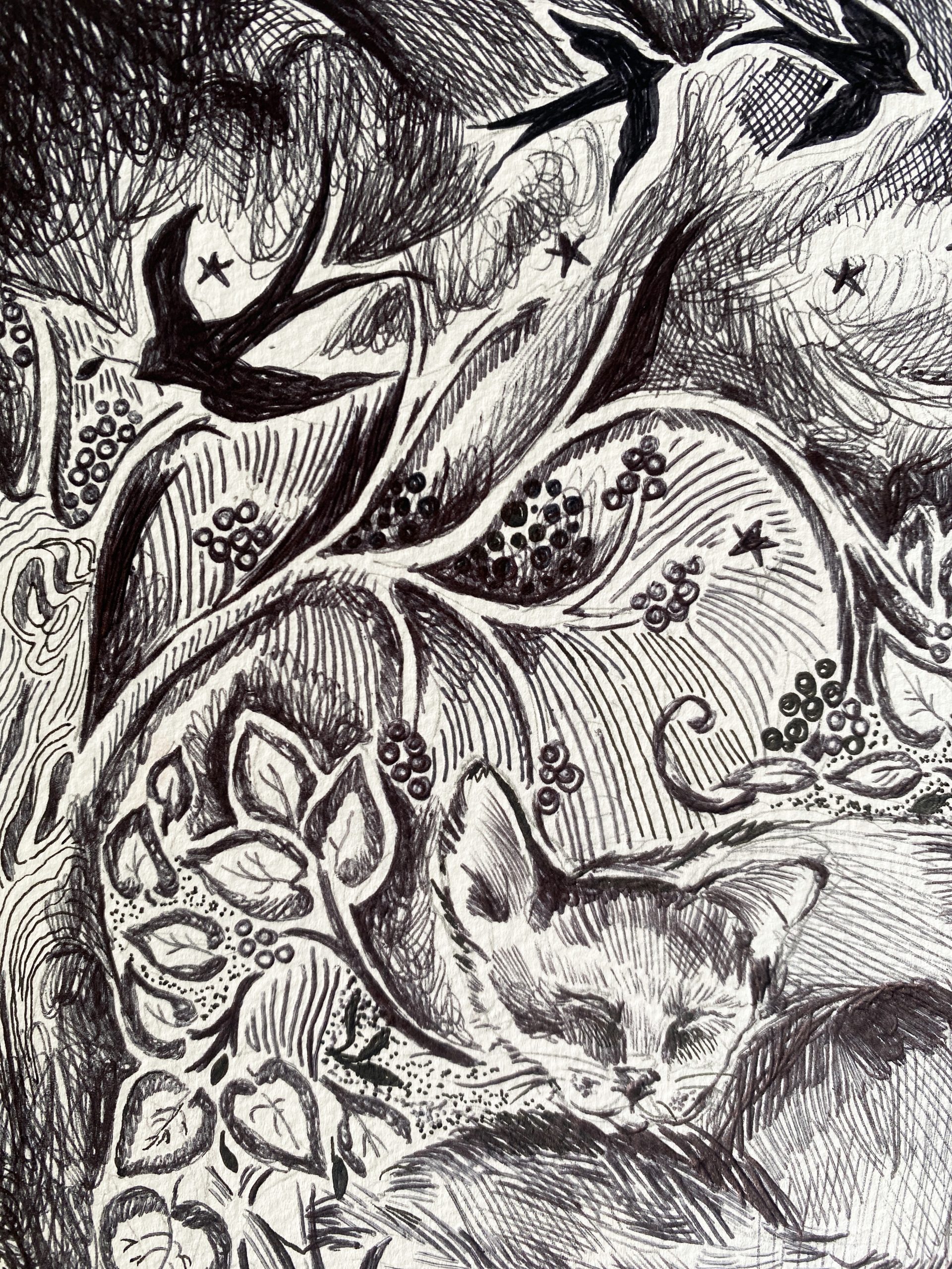 Creating a midnight woodland with lush foliage and hidden animals, using black and white only- inks biro and fine liners.