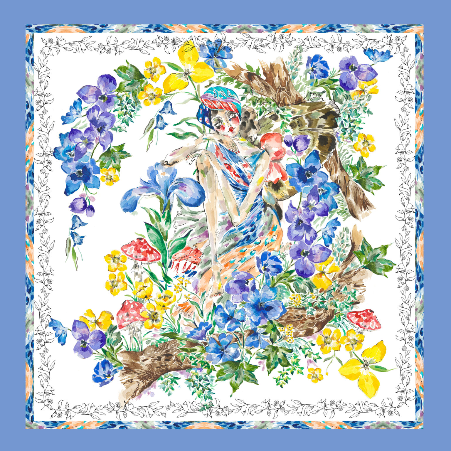 Add an effortless splash of colour and pattern to any outfit with the Iris scarf. This vibrant scarf has a delphinium blue border and hand illustrated Iris fairy nestled amongst striking botanicals.