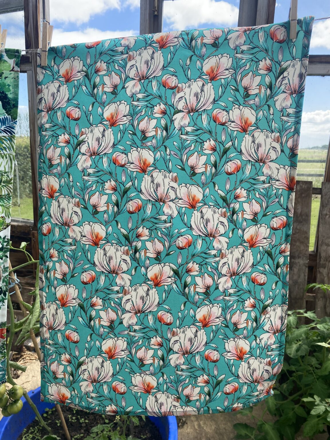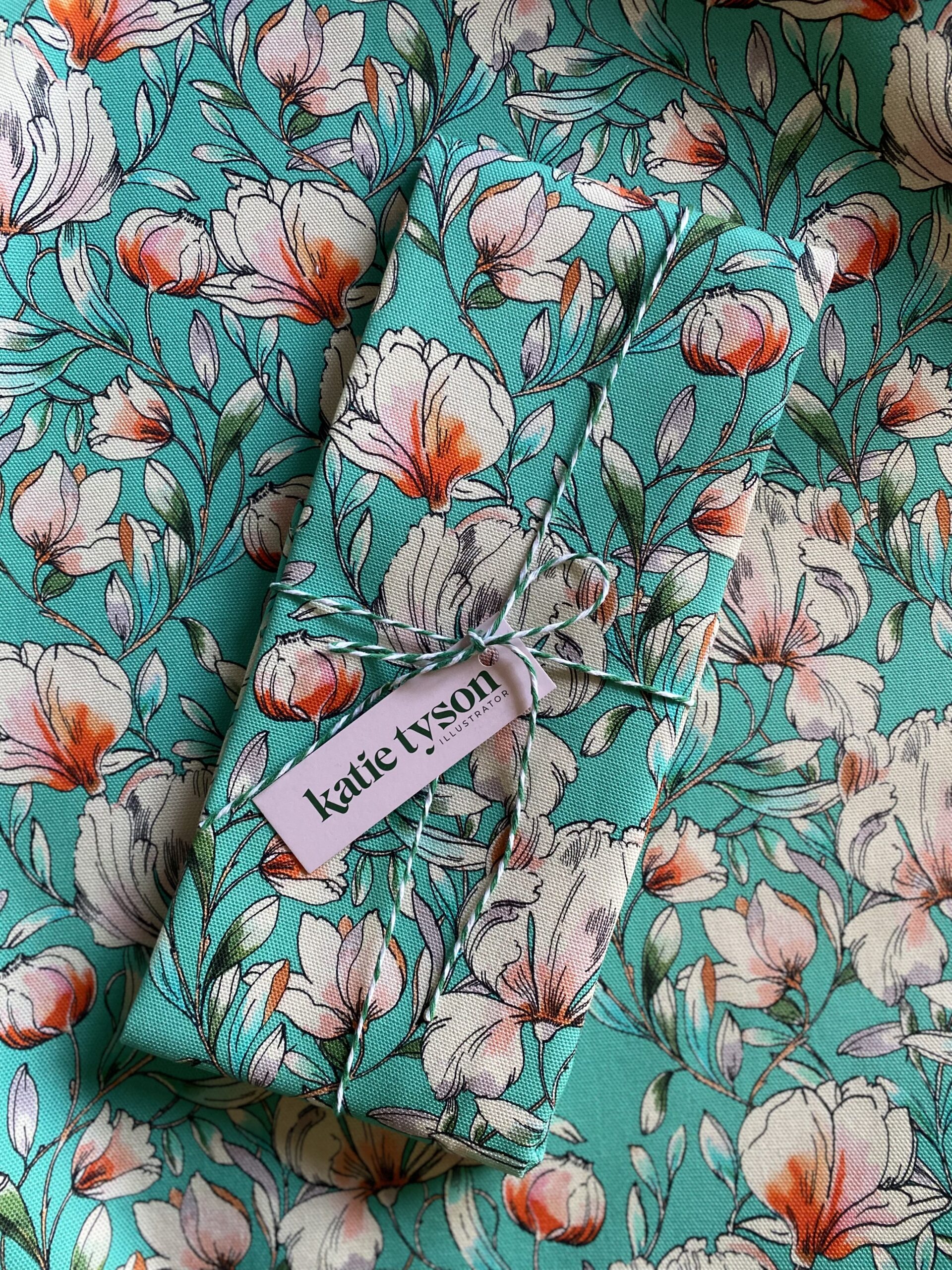 This vibrant Tea Towel features delicate winding Magnolia flowers on a bright aqua ground- inspired by William Morris florals, beautifully printed from my original watercolour paintings.